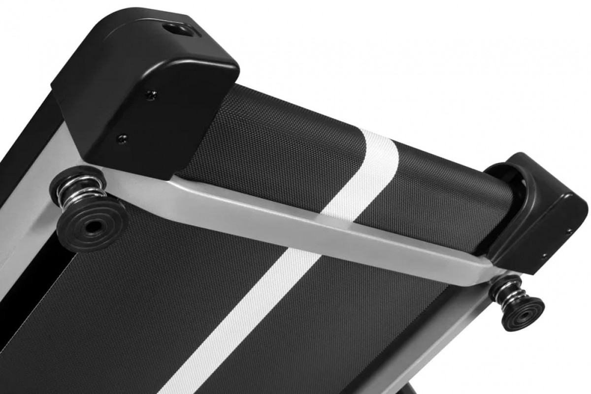 Компактная, мало шумная беговая дорожка для дома. В основе дорожки по-прежнему надежная рама, выдерживающая вес пользователя до 110 кг. Двигатель стал еще надежнее за счет увеличения мощности до 2,0 л.с. в режиме постоянной эксплуатации. Амортизация здесь представлена двумя цилиндрическими эластомерами с пружинами, а также парафинированную демпфирующую деку толщиной 16 мм. и 2-ухслойное полимерное беговое полотно толщиной 1.6 мм.