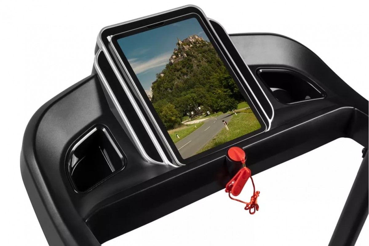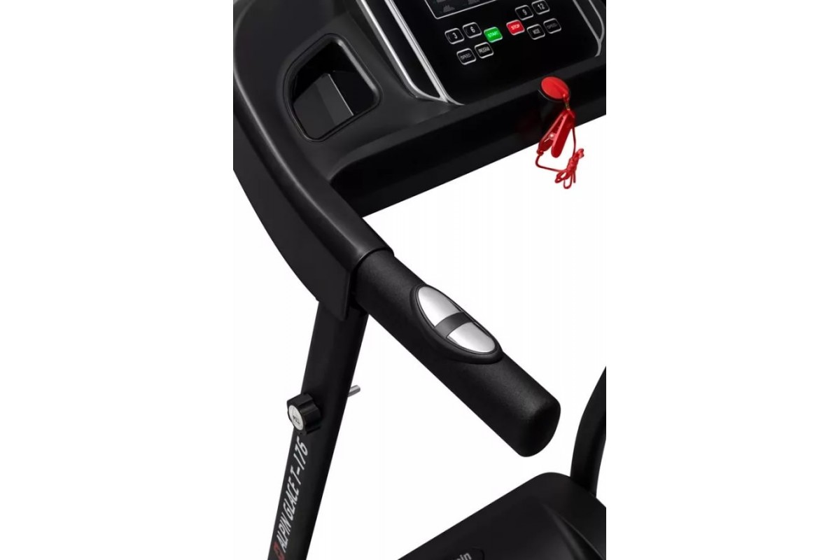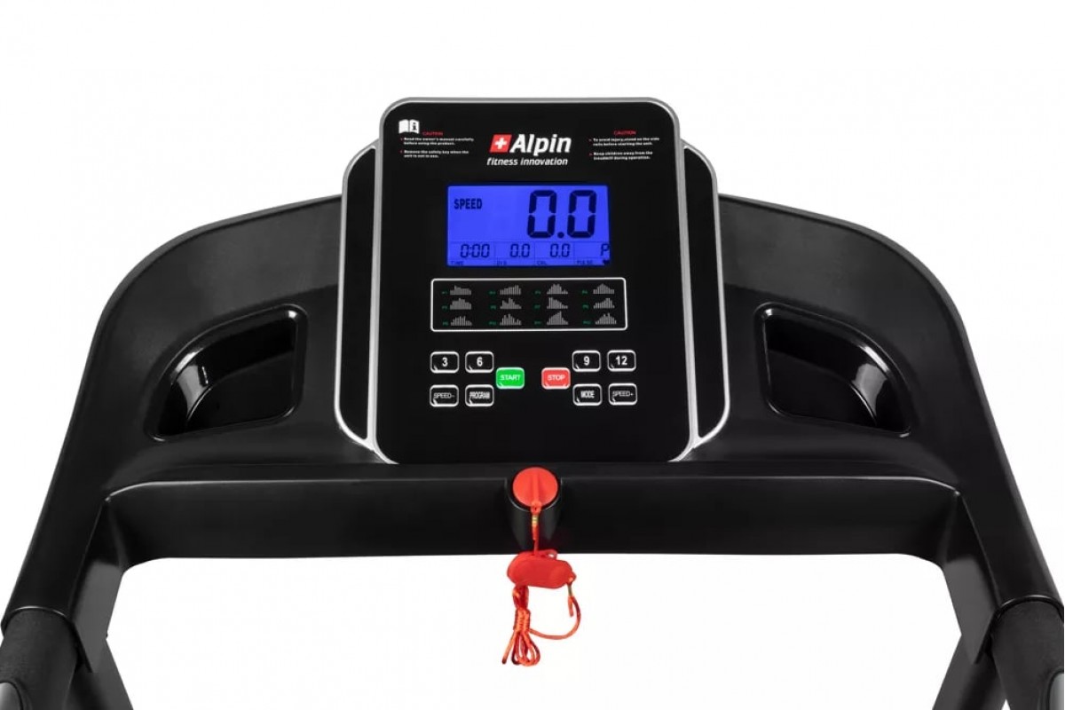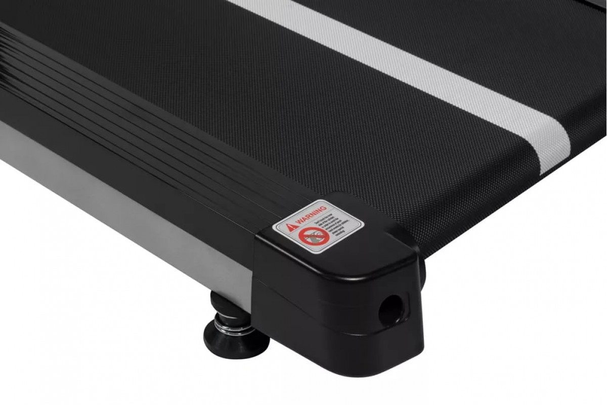 Тренировочный компьютер оборудован большим голубым многофункциональным LCD дисплеем с подставкой под смартфон и планшет. В программный пакет входят 12 предустановленных программ, направленных на тренировку скорости, выносливости, укрепления сердечно-сосудистой системы и похудания. Помимо предустановленных программ, можно воспользоваться самостоятельно регулируемым ручным режимом. На поручнях расположены сенсорные датчики пульса. Перемещение дорожки происходит за счет 2-ух транспортировочных роликов.